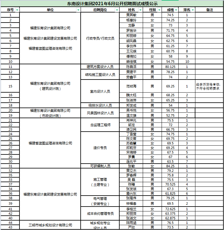 東南設(shè)計集團2021年6月公開招聘面試成績公示