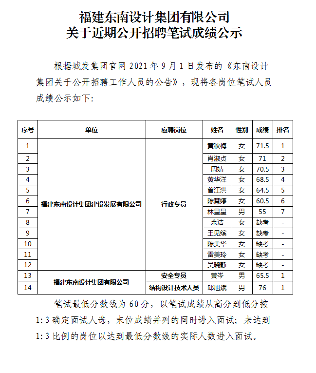 福建東南設(shè)計集團有限公司 關(guān)于近期公開招聘筆試成績公示