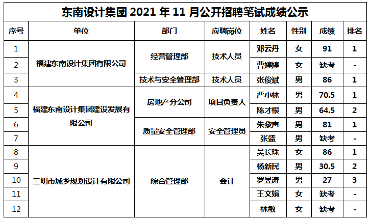 根據城發(fā)集團官網2021年11月9日發(fā)布的《東南設計集團關于公開招聘工作人員的公告》,現將各崗位筆試人員成績公示如下: