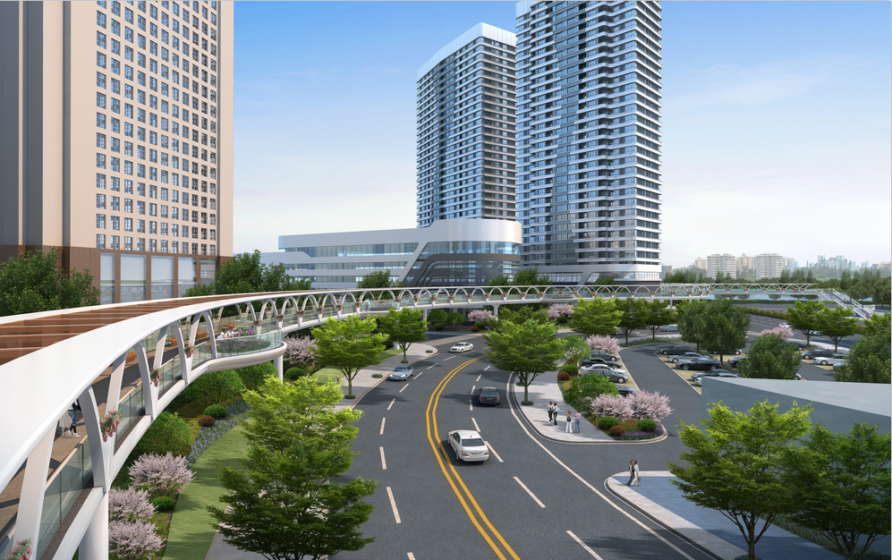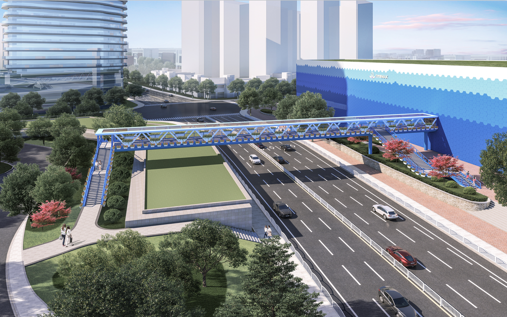 3#天橋位于新市北路上,連通體育場和萬達商場,主橋總長76.5m,總寬5m,凈寬4m,主橋采用鋼桁架梁結(jié)構(gòu),最大跨度為55.8m,橋面鋪裝采用彩色混凝土。